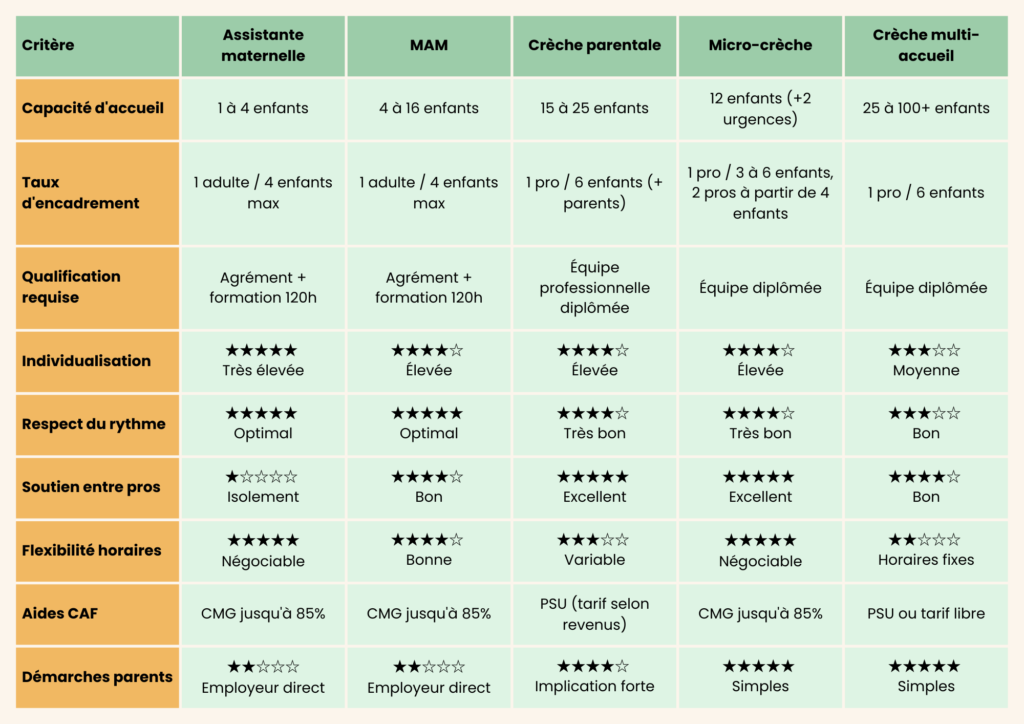 Les crèches multi-accueil proposent différentes formules : accueil régulier à temps plein ou partiel, accueil occasionnel ou d’urgence. Les horaires sont généralement fixes (souvent 7h30-18h30) et peuvent être contraignants pour les parents ayant des horaires atypiques.